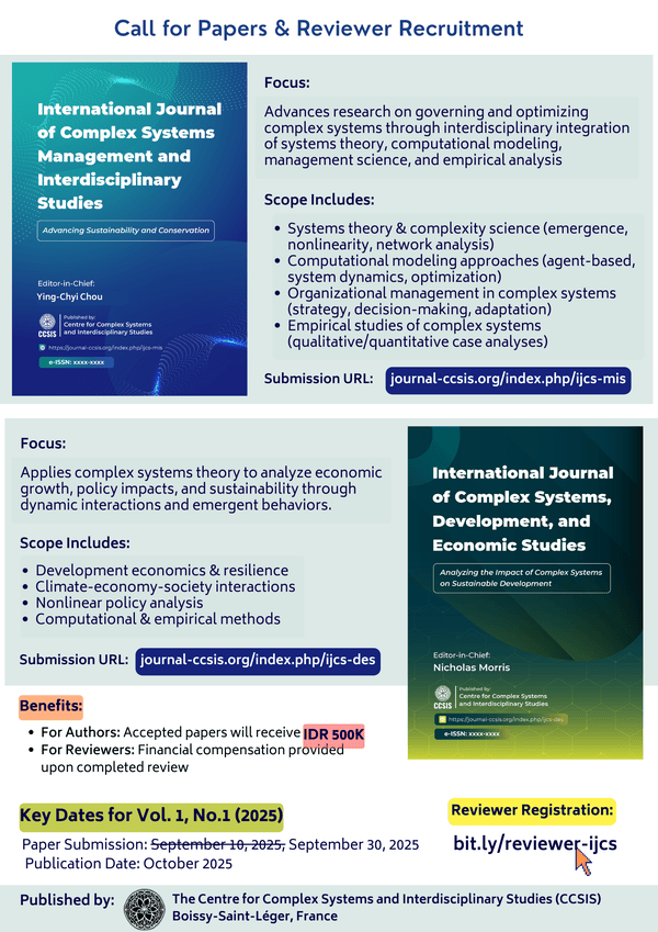 Call for Papers & Reviewers: The International Journal of Complex Systems Management and Interdisciplinary Studies (JCS-MIS) and Journal of Complex Systems, Development, and Economic Studies (JCS-DES) invite submissions and reviewers for their 2025 inaugural issues. These CCSIS-published journals offer honoraria for accepted papers and compensation for reviewers. Submit by September 30, 2025 via journal-ccsis.org/index.php/ijcs-mis and journal-ccsis.org/index.php/ijcs-des or join as a reviewer at bit.ly/reviewer-ijcs.